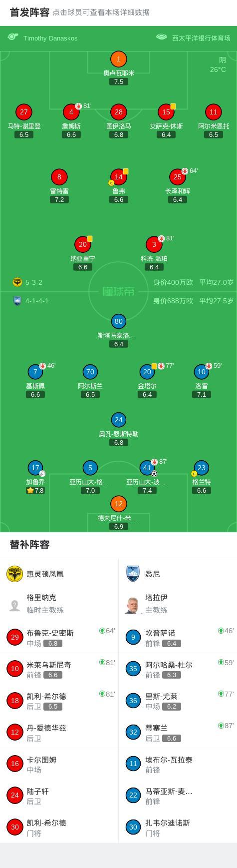 北京時間3月1日澳大利亞足球超級聯賽 聯賽 第19輪,惠靈頓鳳凰主場對陣悉尼。悉尼亞歷山大-波波維奇破門。最終比分惠靈頓鳳凰 0-1 悉尼。