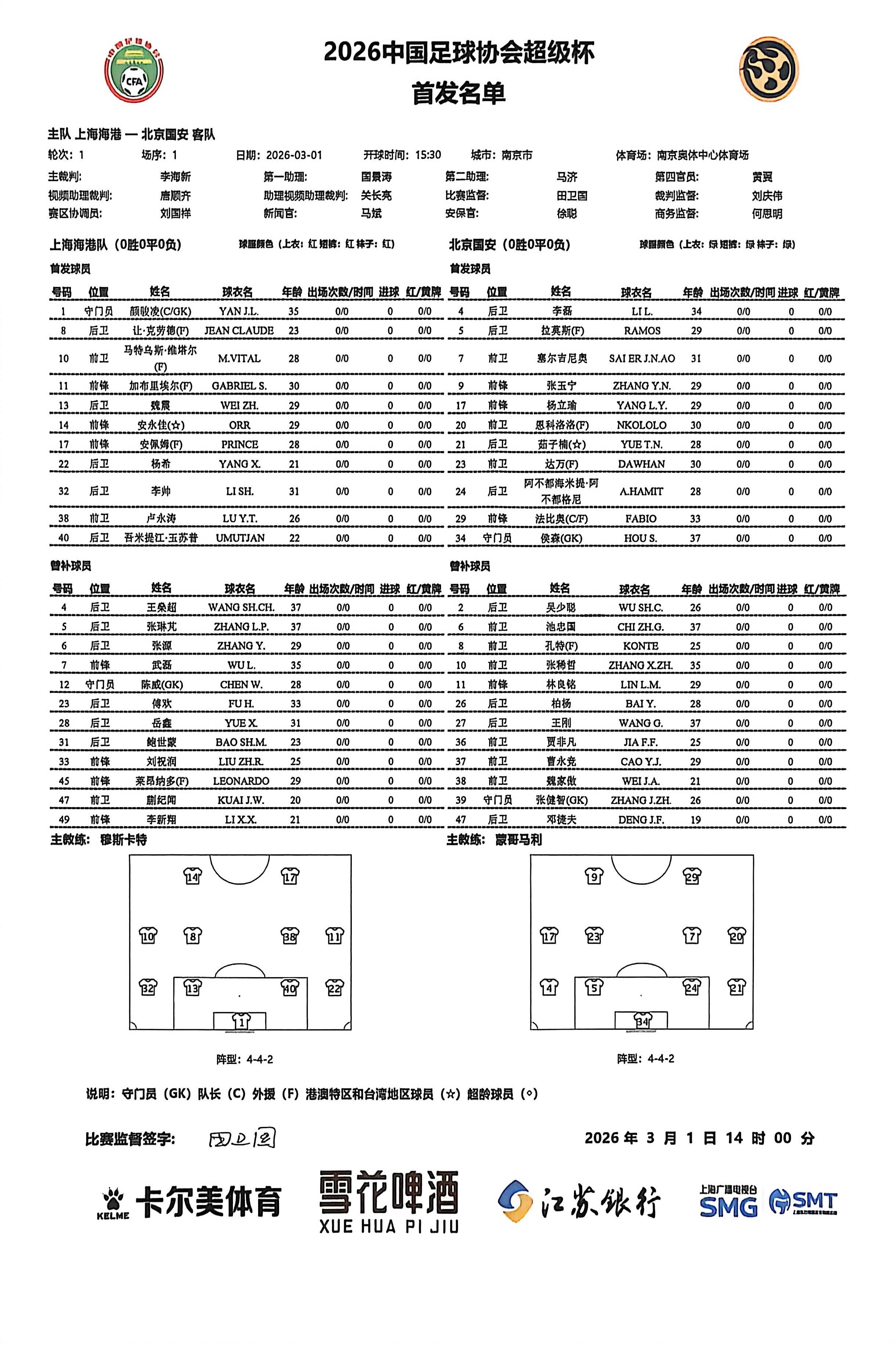 北京時間3月1日15:30,2026中國足球協會超級盃在南京奧體中心體育場展開角逐,上海海港對陣北京國安,本場主裁判爲李海新,VAR裁判爲唐順齊,賽前雙方首發出爐。
