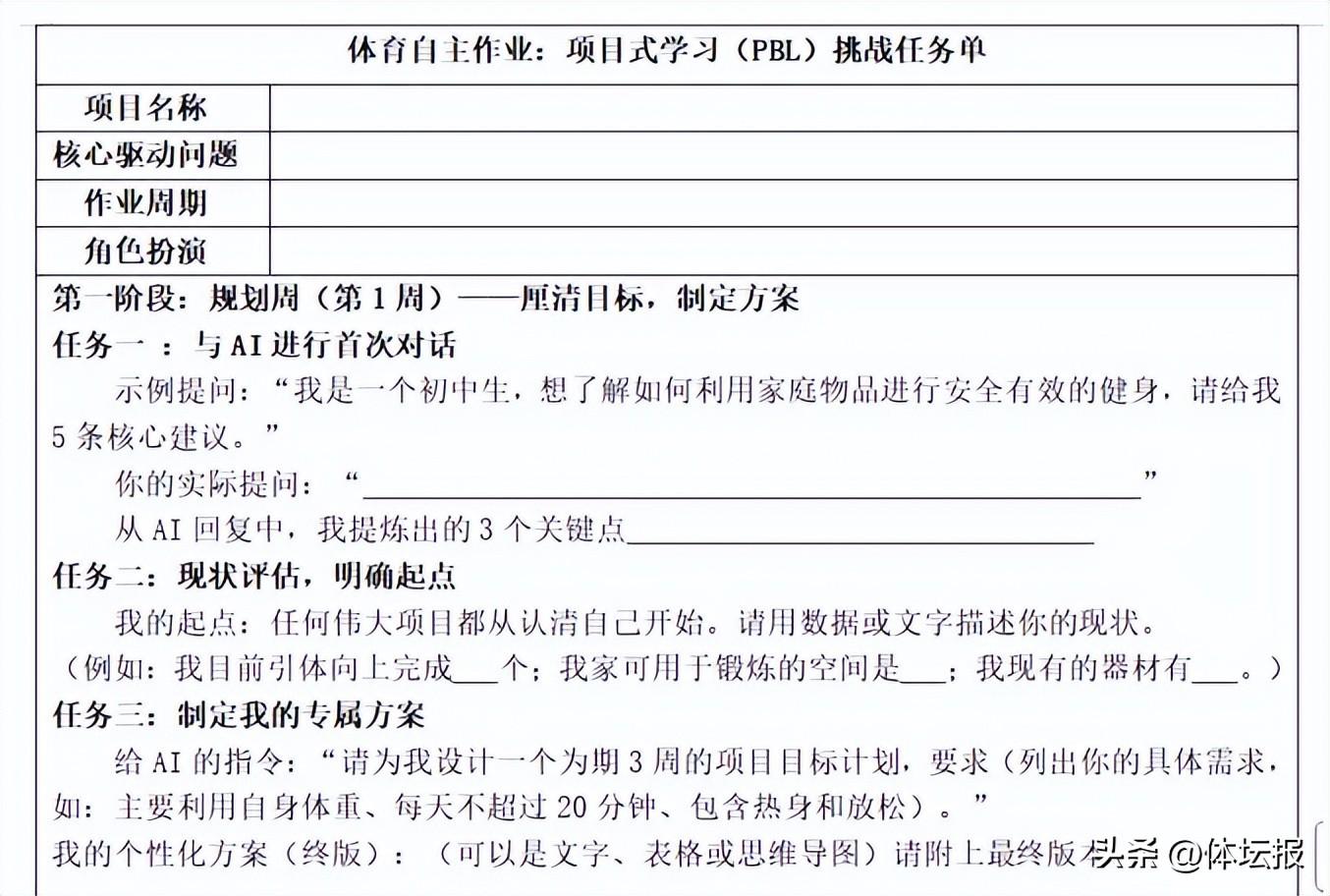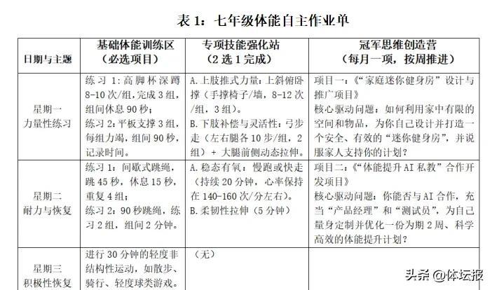 在此基礎上學生可主動“加餐”,挑戰項目式學習(PBL)任務,鍛鍊體能的同時運用掌握創意設計、數字化工具應用等多種技能。設計者朱芳波老師介紹,這份作業的核心是激發興趣、培養自主能力,引導學生構建適合自己的鍛鍊方式,收穫幸福感,促進全面發展。