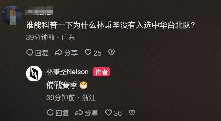 林秉聖此前曾入選中國臺北男籃代表隊,但在此次窗口期落選,無緣出戰世預賽,有球迷在評論區詢問爲什麼落選,林秉聖回覆道是爲了備戰賽季。