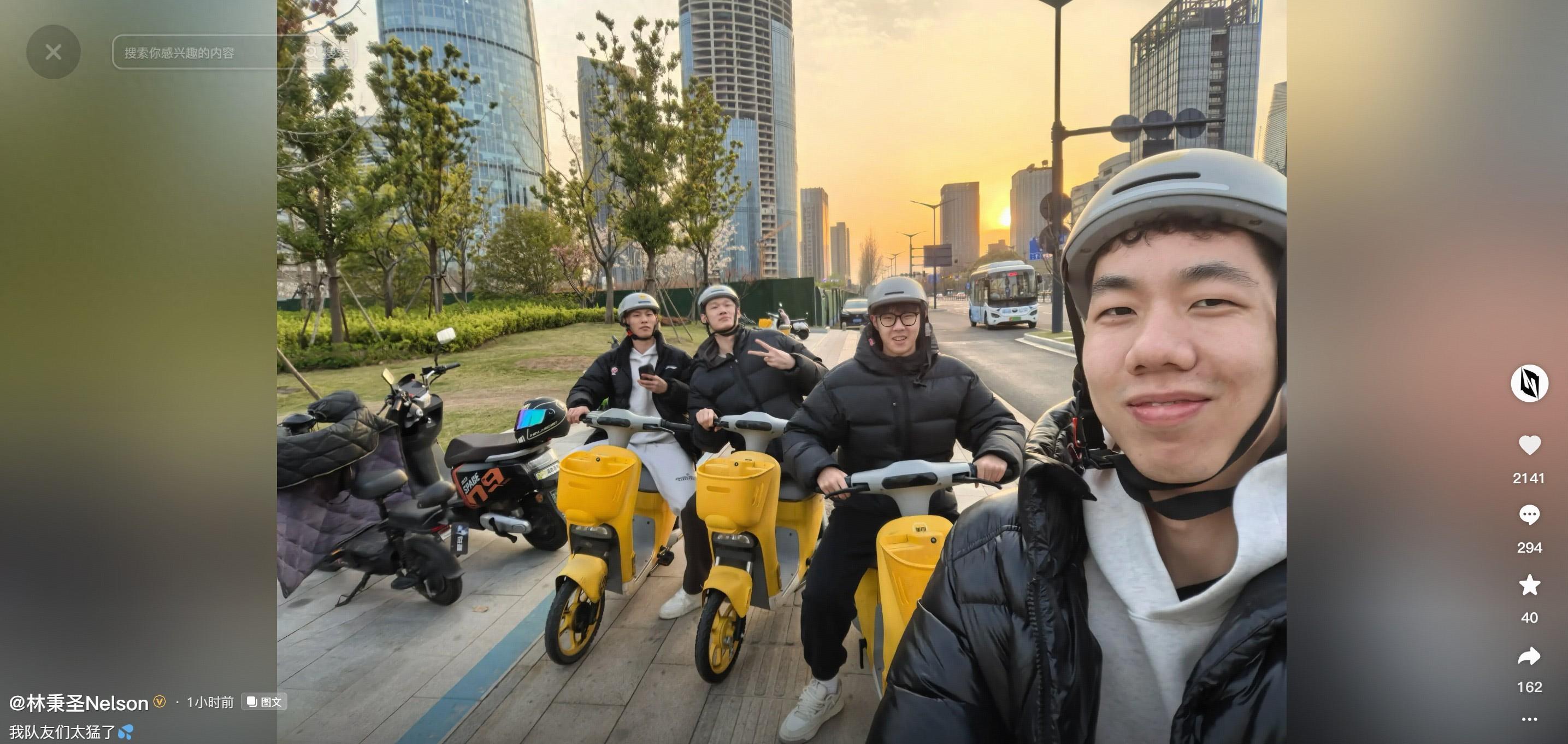 賽後,中國臺北男籃球員、現浙江廣廈球員林秉聖更新社媒,曬出與俱樂部隊友朱儁龍、趙嘉仁、胡金秋騎共享電動車的合影,並配文:我隊友們太猛了。