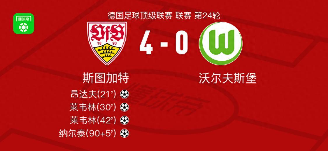 北京時間3月1日德國足球頂級聯賽 聯賽 第24輪,斯圖加特主場對陣沃爾夫斯堡。斯圖加特昂達夫破門,萊韋林梅開二度,納爾泰破門。最終比分斯圖加特 4-0 沃爾夫斯堡。