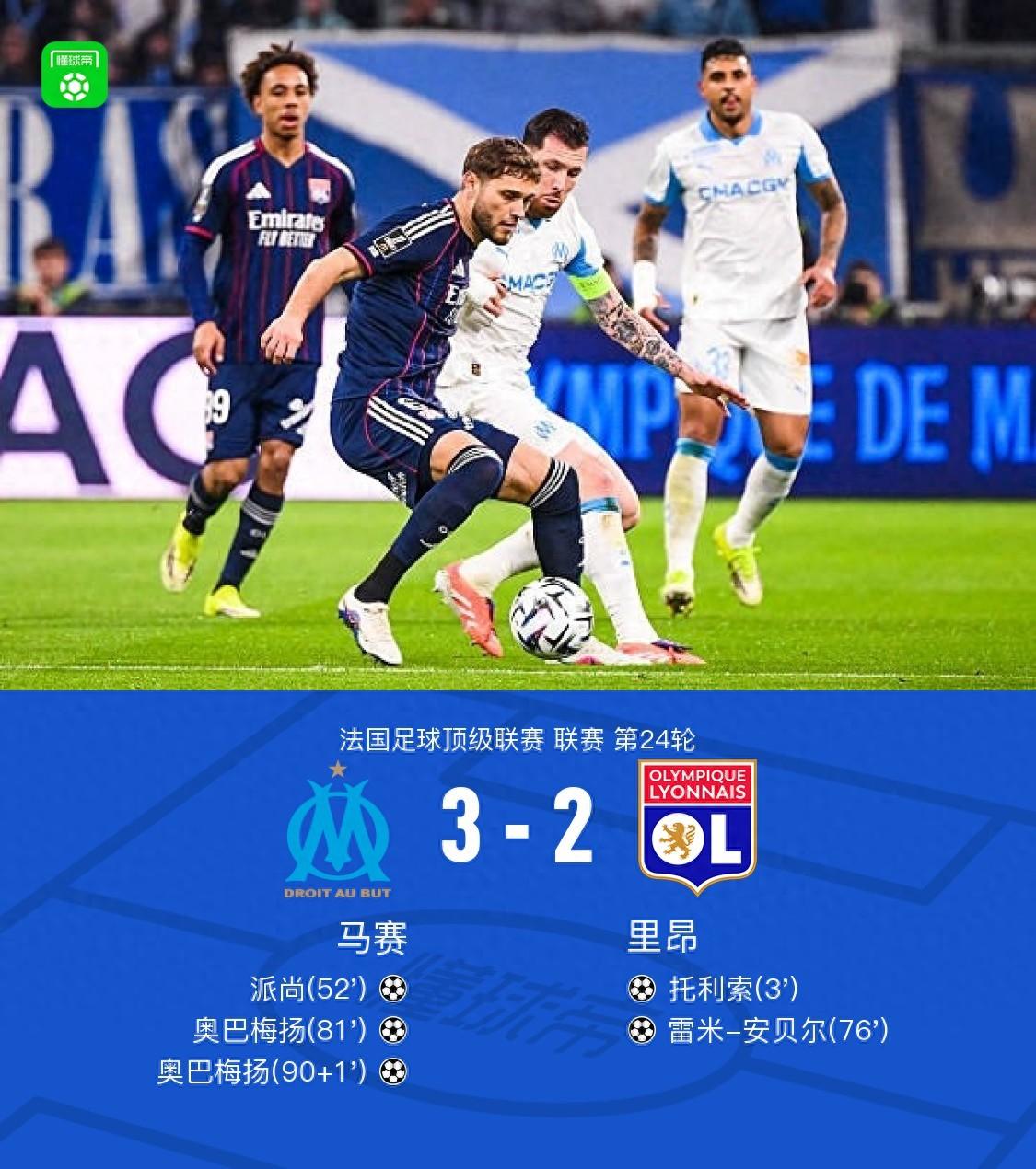 北京時間3月2日法國足球頂級聯賽 聯賽 第24輪,馬賽主場對陣里昂。馬賽派尚破門,奧巴梅揚梅開二度。里昂託利索破門,雷米-安貝爾破門。最終比分馬賽 3-2 里昂。