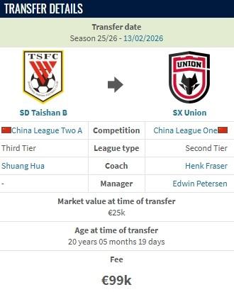 德轉:陝西聯合簽下泰山B隊後衛孟繁寧的轉會費約80萬人民幣