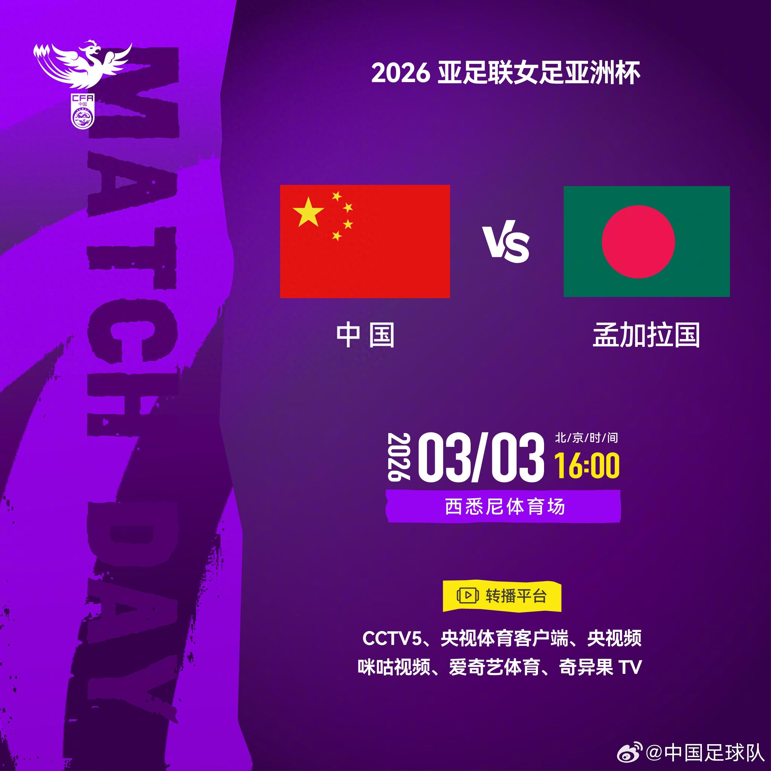北京時間3月3日16:00,女足亞洲盃B組第1輪,中國女足將對陣孟加拉國女足。比賽場地爲西悉尼體育場。