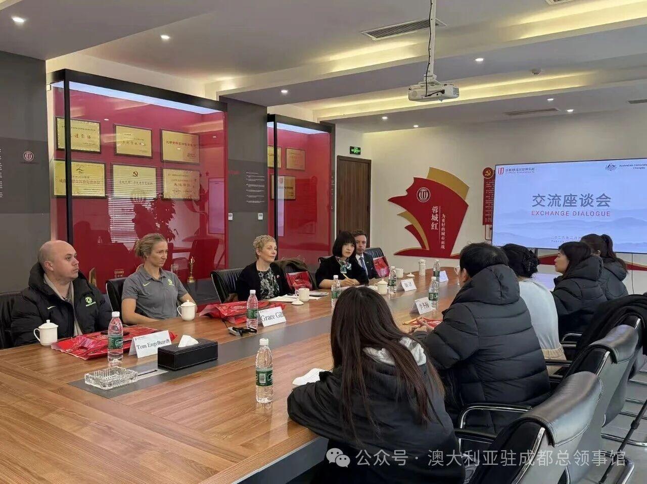 據澳大利亞駐成都總領事館消息,在今年2月,澳大利亞駐成都總領事邵美珍、領事米克、格蕾絲和湯姆一行到訪成都蓉城足球俱樂部。
