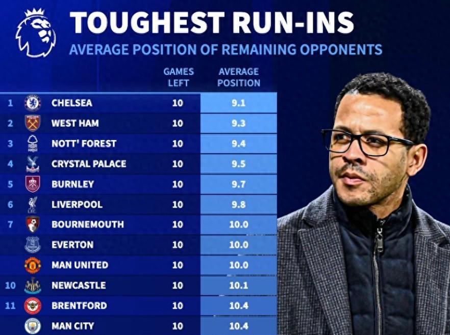 德轉統計英超剩餘10輪各隊對手平均排名:切爾西賽程難度最高