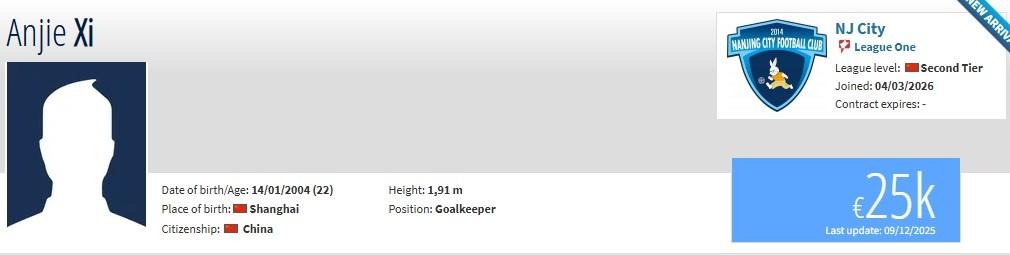 奚安傑現年22歲,司職門將,在2025賽季夏窗從上海海港租借加盟南京城市,目前共出場2次,此次爲正式加盟。德轉顯示轉會費爲2.5萬歐元,約20萬人民幣。