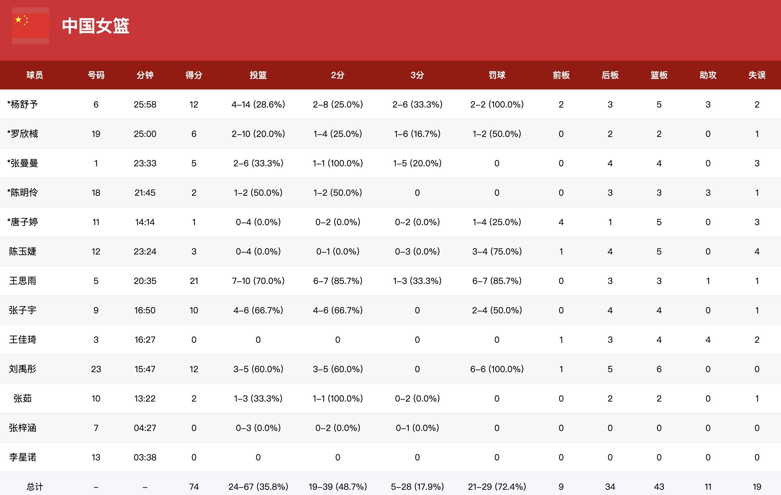 數據方面,中國女籃王思雨21分3板,楊舒予12分5板,劉禹彤12分6板,張子宇10分4板2帽。