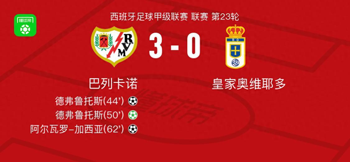 巴列卡諾3-0大勝皇家奧維耶多,德弗魯託斯雙響,阿爾瓦羅-加西亞破門