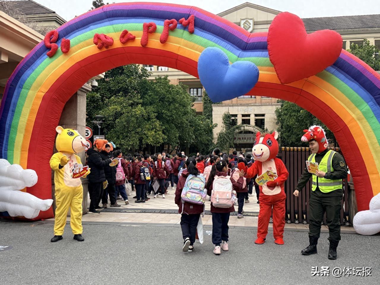 轉盤上寫滿了契合馬年的吉祥祝福語,寄託着學校對學生身心健康的美好祝願。書記和校長們更是“扮馬”上陣,讓孩子們帶着驚喜與期待走進校園。