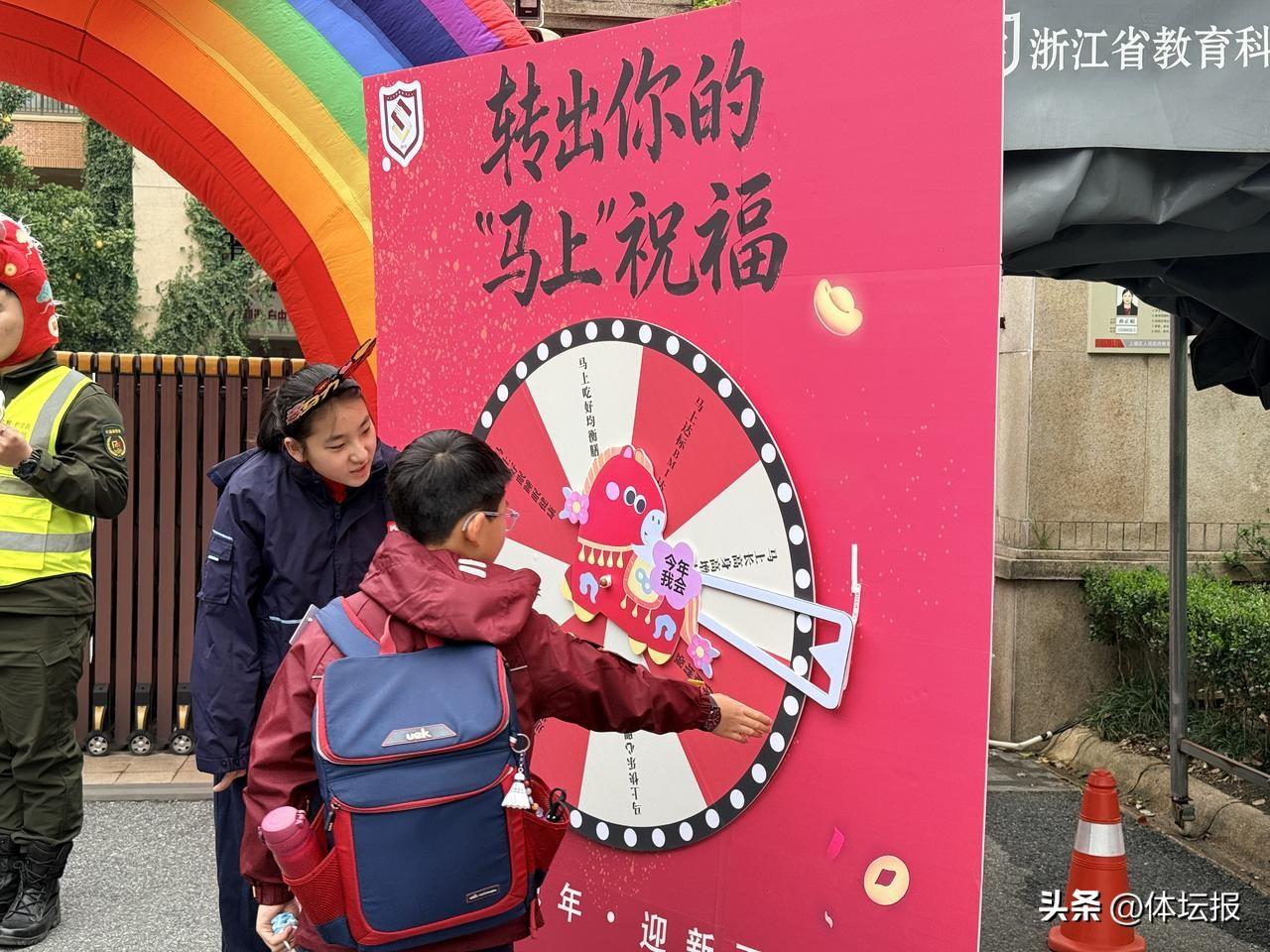 3月4日清晨,伴着歡聲笑語,杭州市省教院實驗學校的校門口格外熱鬧。一座滿載祝福的幸運大轉盤矗立門前,迎接返校學子。“哇!我轉到了‘馬上長高’!”“我是‘馬上有勁’!”同學們興奮地轉動轉盤,收穫新學期的第一份祝福。