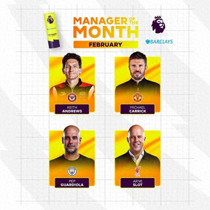 北京時間3月5日,英超官方公佈了2月最佳主帥的候選名單,其中安德魯斯、卡里克、瓜迪奧拉和斯洛特在列。
