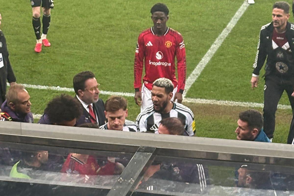 B費與喬林頓互嗆,兩人被強行隔開。B費用手指着這位紐卡斯爾聯的強硬中場,或許是在提醒他能留在場上已是僥倖。