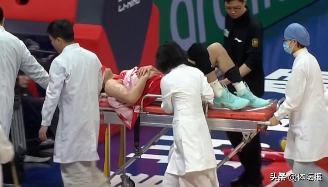 隊醫上來觀察之後,擔架車進場,郭艾倫被攙扶上擔架車,毛巾蓋着頭離場。郭艾倫一度情緒崩潰仰面痛哭。