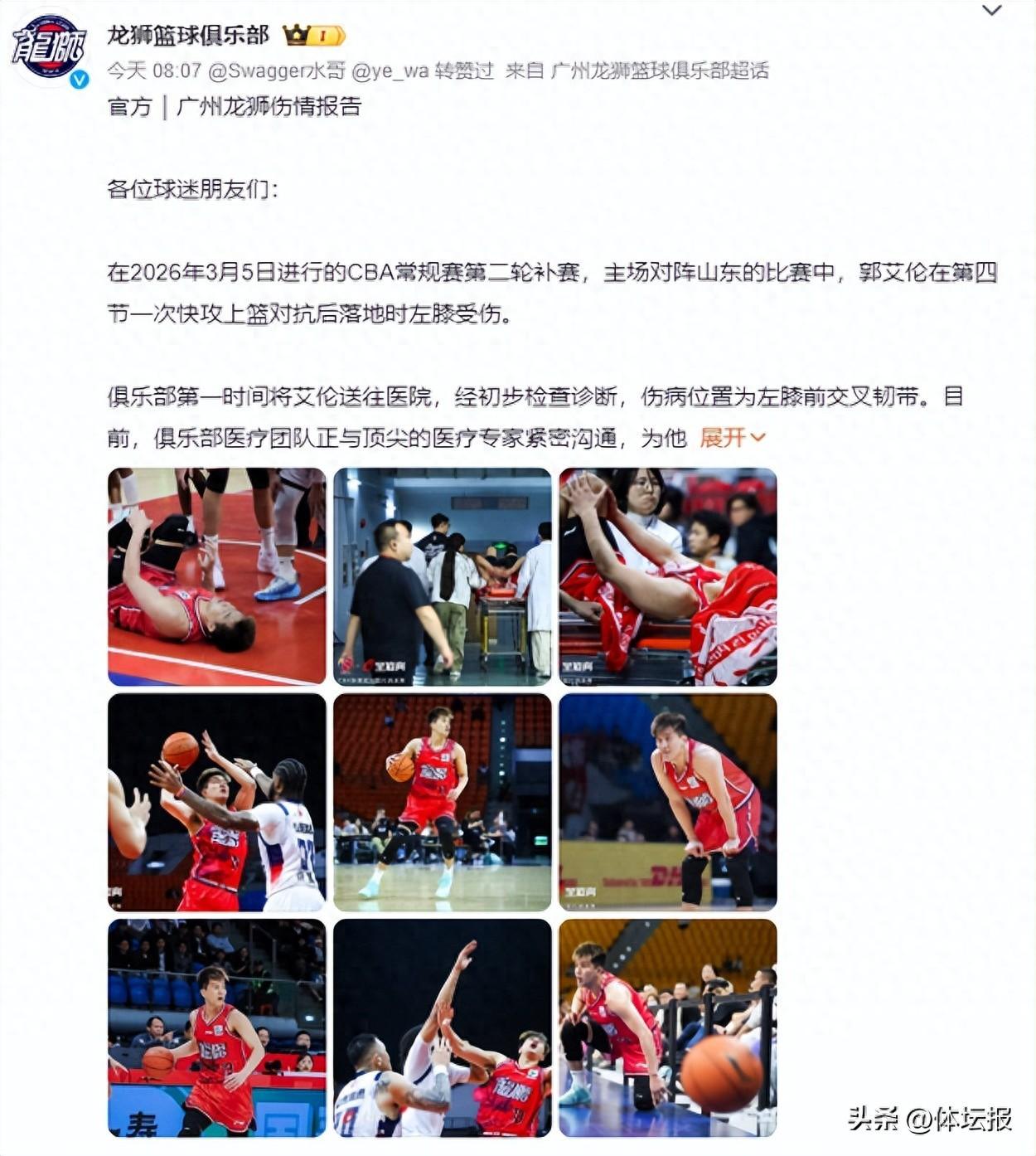 3月5日進行的CBA常規賽第二輪補賽,廣州主場93比85戰勝山東。比賽第四節的一次廣州反擊中,郭艾倫持球對抗上籃,但左膝一軟倒地,隨後郭艾倫捂着左膝長時間未起,比賽進入暫停。