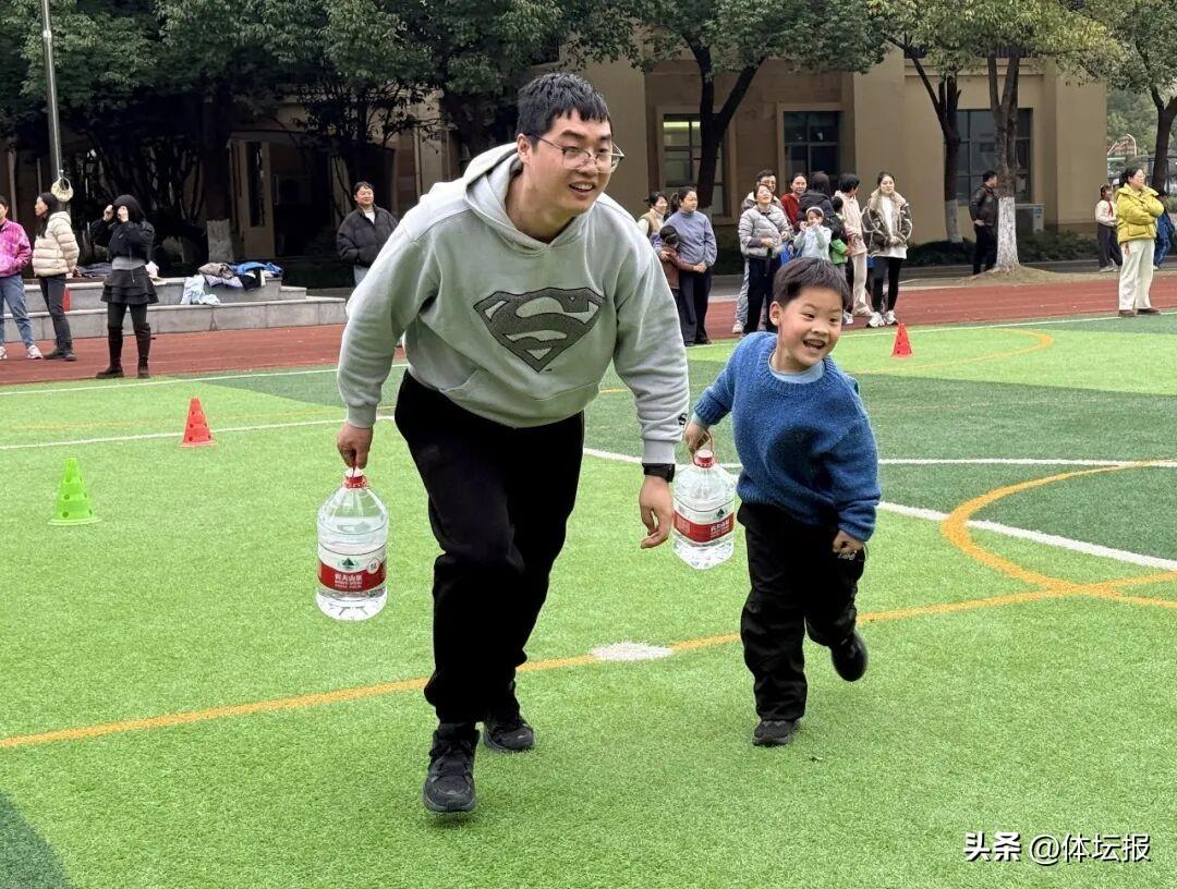 學校自2024年起在“校園吉尼斯”中加入親子賽環節,這項活動每次開學都與時俱進升級創新,本次主題聚焦於“健康”。親子賽共設三關:矇眼同行10米、負重接力20米和兩人三足衝刺往返30米,每個班級派出三組家庭(一大一小)接力參賽。賽場上,家長與孩子或牽手摸索前行,或拎着水桶奮力奔跑,加油聲、歡笑聲此起彼伏,構成一幅充滿溫馨、活力的開學畫卷。