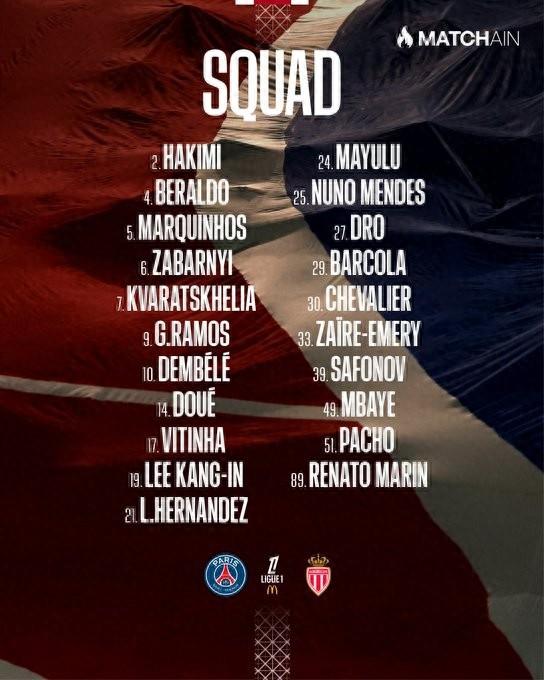 巴黎對陣摩納哥大名單: