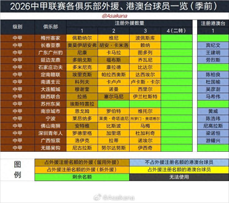 北京時間3月7日凌晨0:00,2026賽季中甲冬季轉會窗已正式關閉。2026賽季中甲共有12隊使用港澳臺名額。