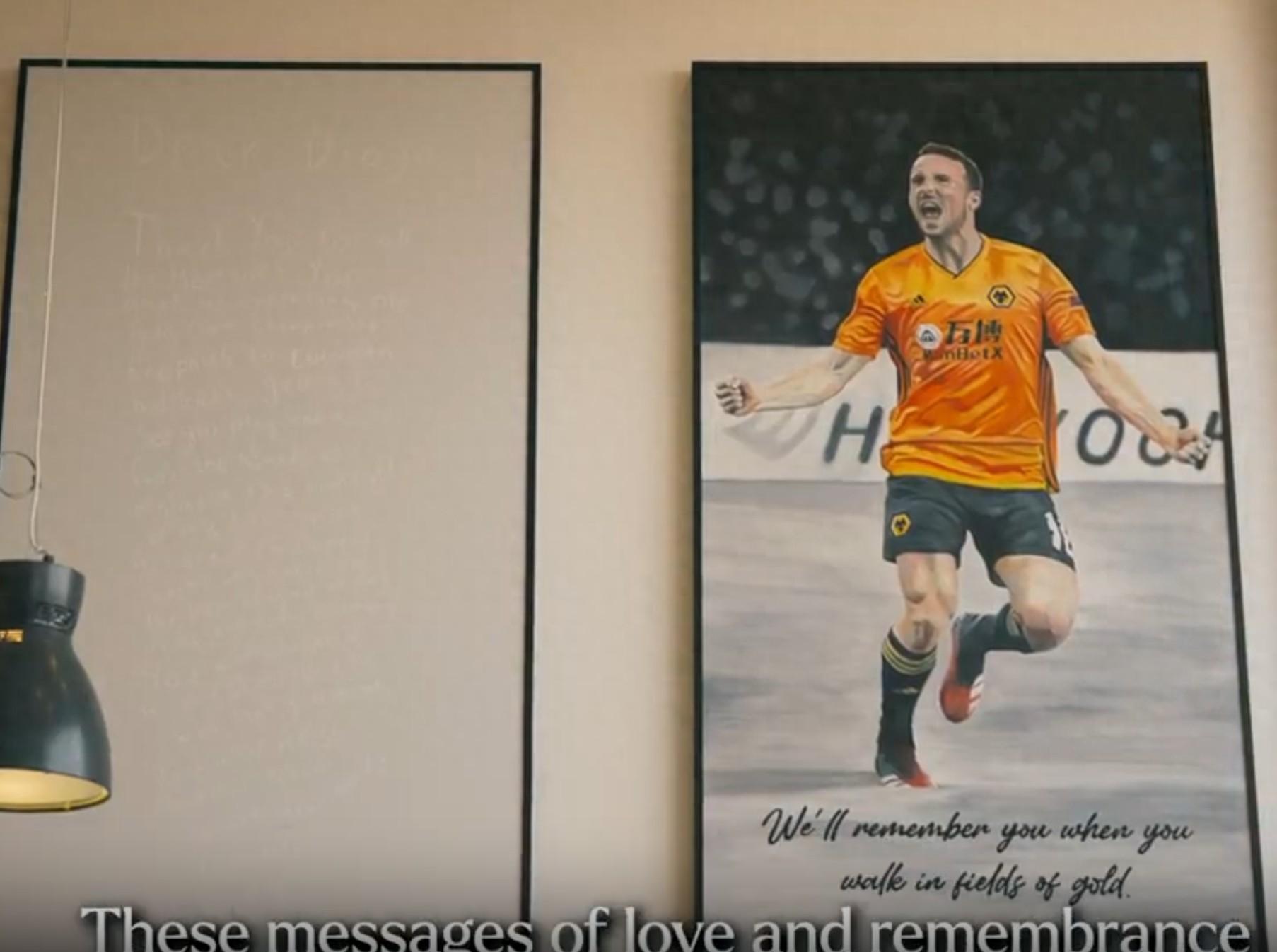 狼隊展出紀念若塔的畫作,據悉顏料由球迷悼念若塔的花朵中提取