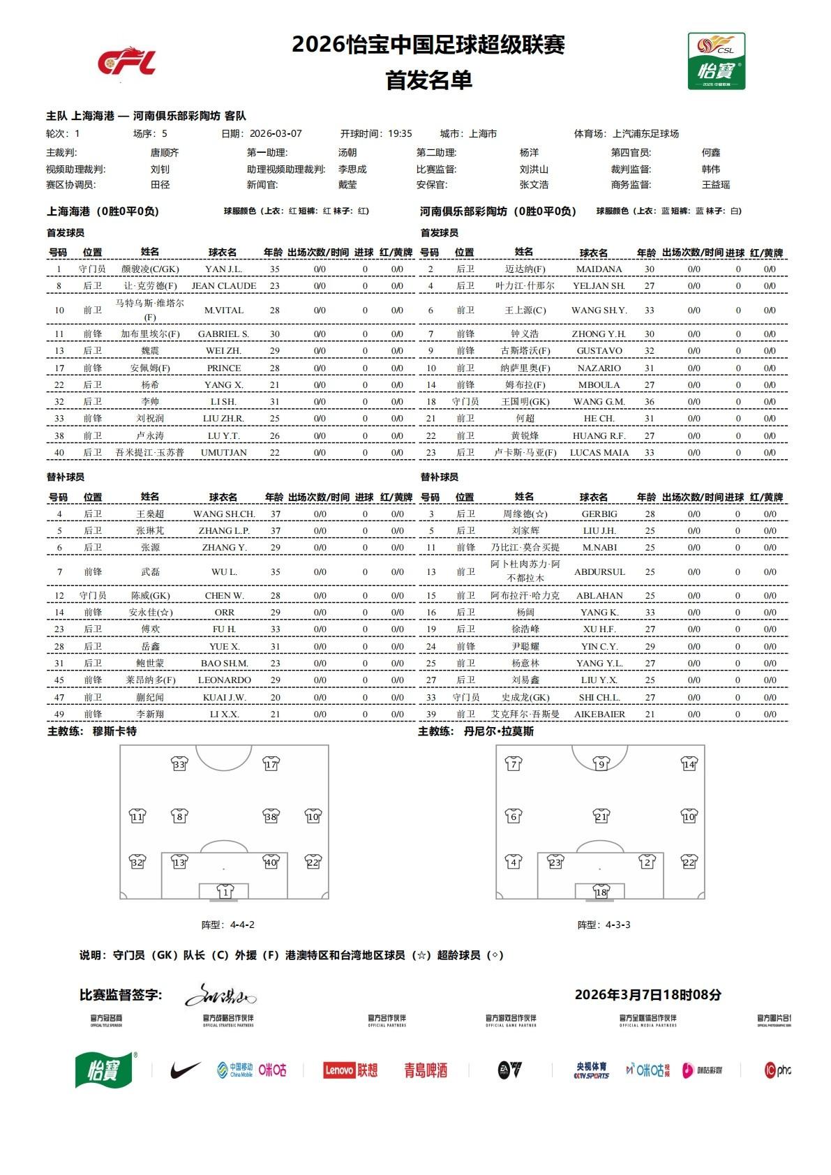 北京時間3月7日19:35,中超第1輪繼續進行,上海海港坐鎮上汽浦東足球場迎戰河南,本場主裁判爲唐順齊,VAR裁判爲劉釗,賽前雙方首發出爐。