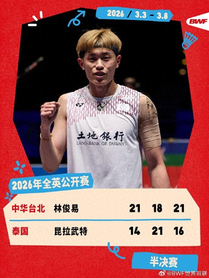 3月7日,2026年全英羽毛球公開賽男單半決賽中,中國臺北選手林俊易與泰國名將昆拉武特激戰三局,最終以2-1(21-14、18-21、21-16)取勝,晉級決賽,整場比賽耗時88分鐘。