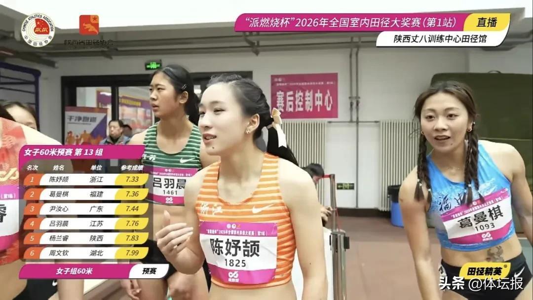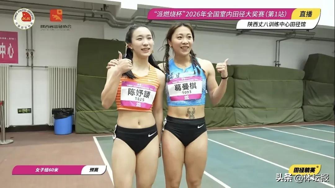女子60米的比賽在預賽中就上演巔峯對決,全國紀錄7秒10保持者葛曼棋與陳妤頡同分在第13組。比賽中,位於第6道的葛曼棋起步迅速,率先搶佔領先位置,而身處第4道的陳妤頡起跑稍顯遲緩,但憑藉強大的途中跑能力迅速反超,最終以7秒33率先撞線,葛曼棋以7秒36位列小組第二。這也是兩人在室內60米賽場的第二次直接對話——2024年全國室內田徑大獎賽西安站,葛曼棋曾以7秒21奪冠,陳妤頡跑出7秒29摘銀。之後的2025年,葛曼棋缺席室內賽事,陳妤頡則在濟南站創下7秒26的個人最好成績,並刷新了亞洲少年紀錄。