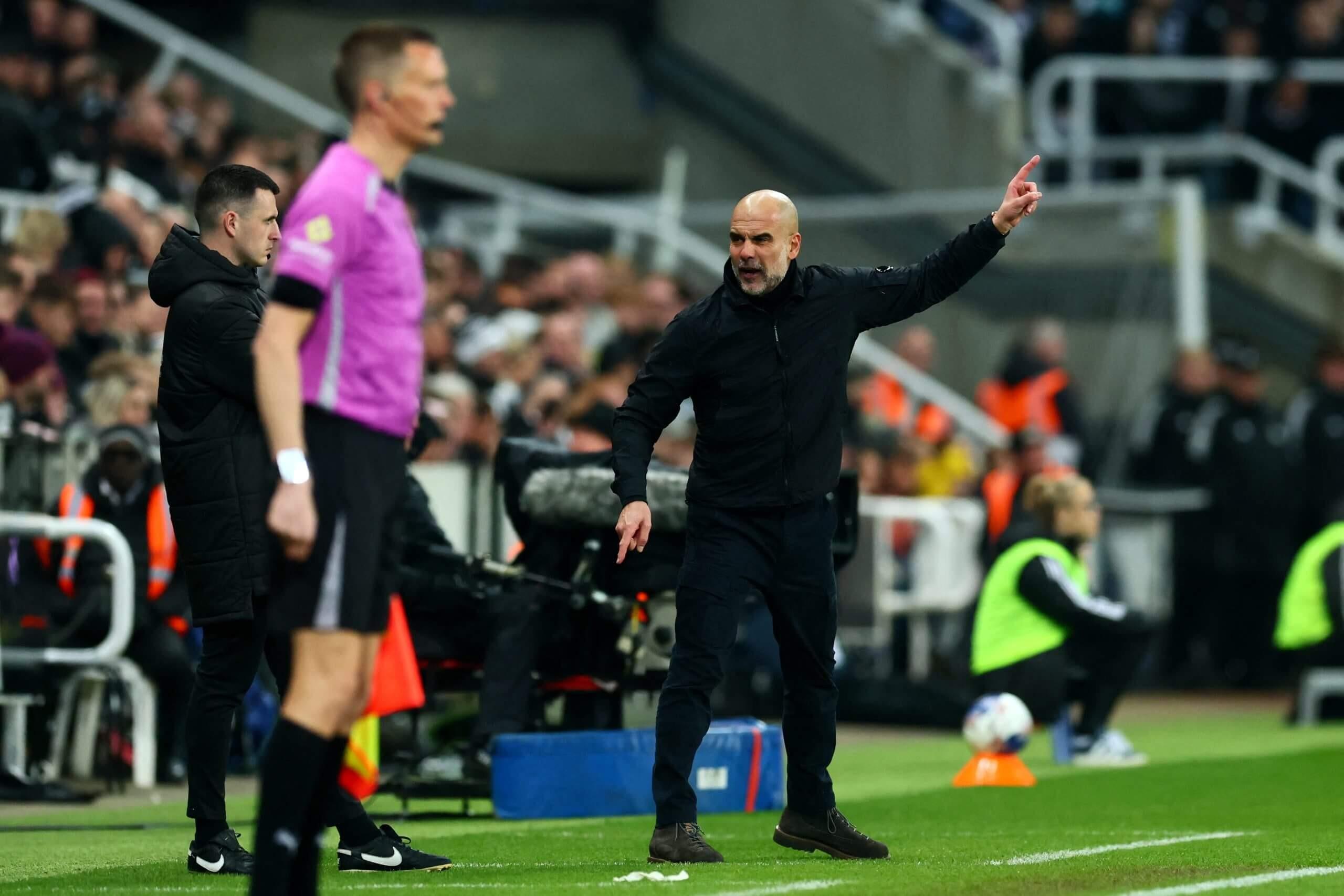 令曼城主帥瓜迪奧拉震驚,並立即引發他憤怒的是,裁判沒有判罰犯規。在沮喪地上下跳了幾下然後憤怒地脫下外套後,他對紐卡斯爾獲得任意球做出了諷刺性的反應。
