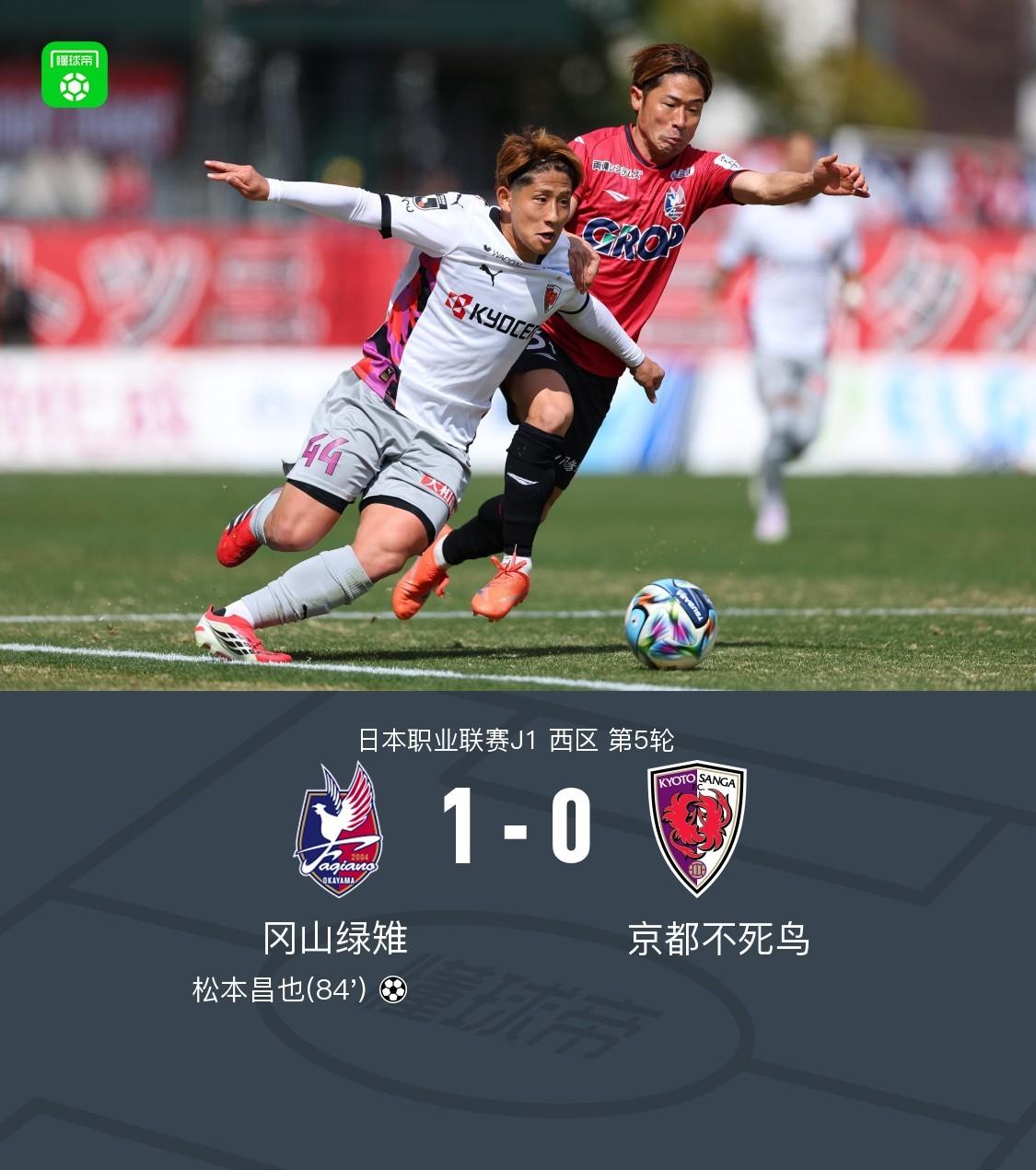 北京時間3月8日11:55,日本職業聯賽J1西區第5輪,岡山綠雉主場對陣京都不死鳥。松本昌也攻入全場比賽唯一進球。最終比分岡山綠雉1-0力克京都不死鳥。