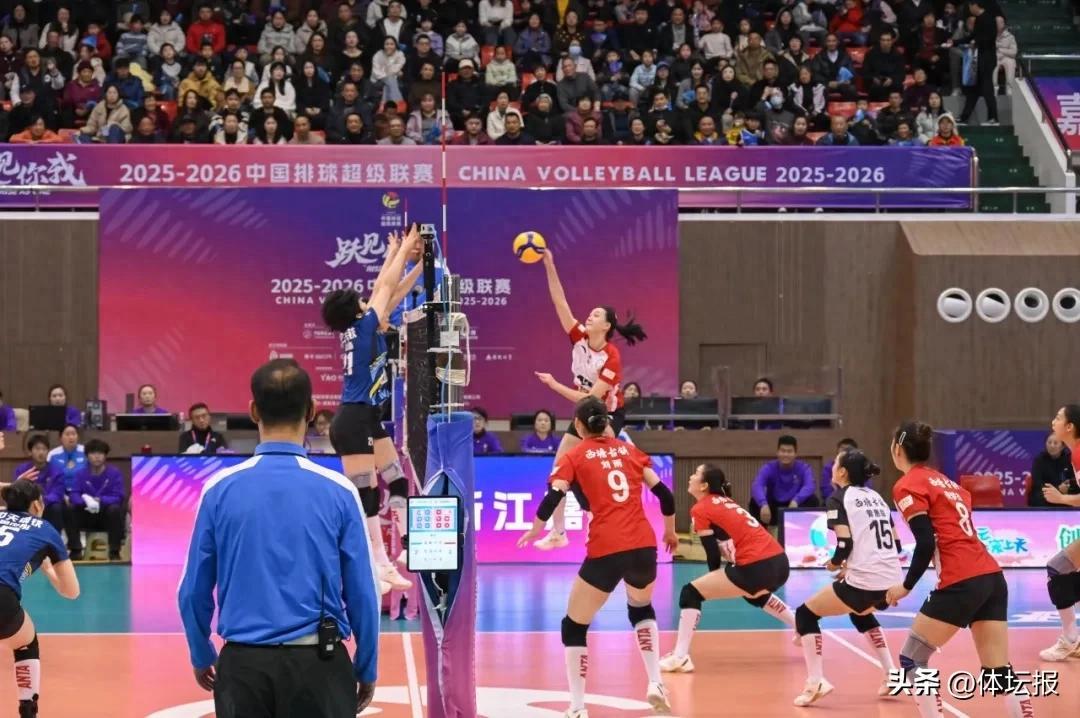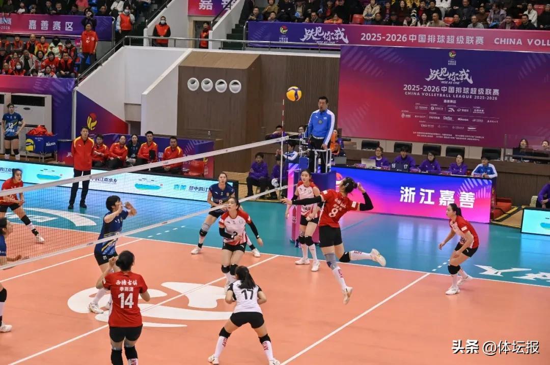 3月7日,2025-2026中國女子排球超級聯賽A級季後賽第十八輪比賽在嘉善縣體育中心體育館結束,浙江西塘姚莊女排主場1比3再負江蘇中天鋼鐵女排。