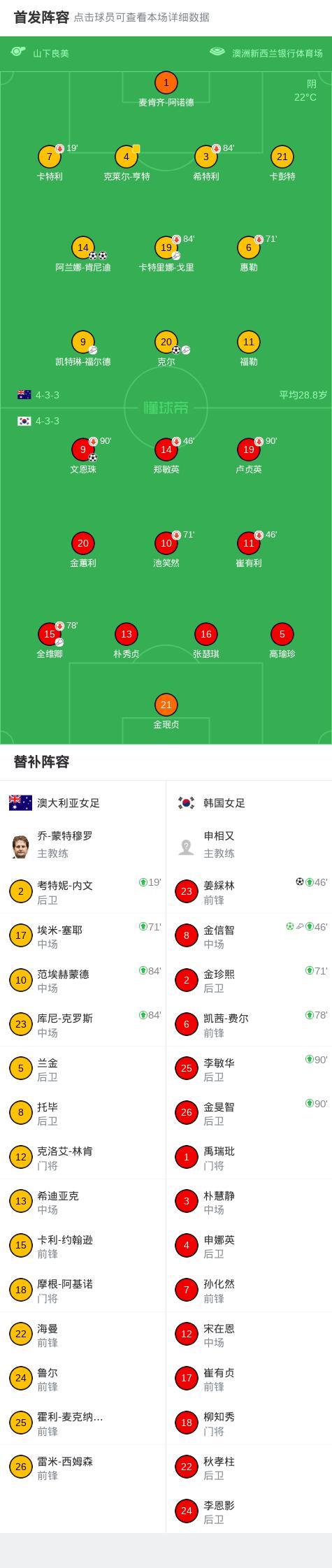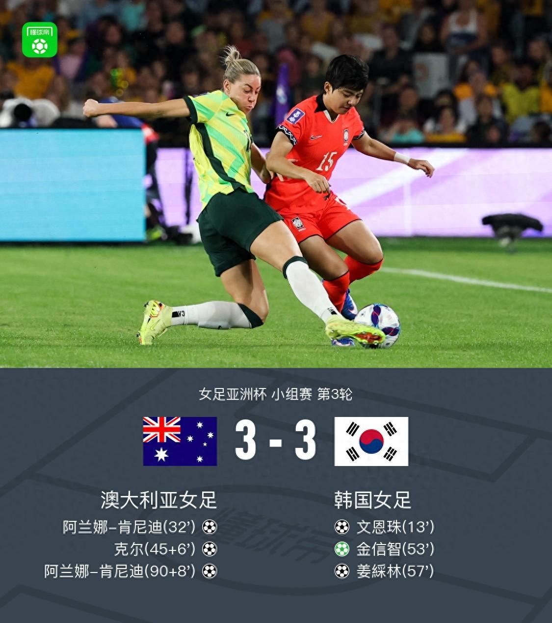 女足亞洲盃韓國3-3澳大利亞,雙方以小組第一和第二進入淘汰賽