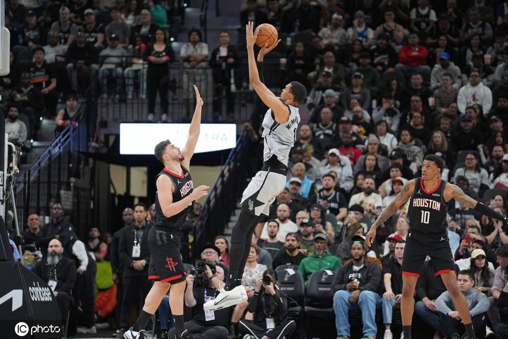 上半場最後45秒,馬刺隊其實就已開始起勢了,哈珀和福克斯兩次強突如手術刀一般劃開火箭的防線,逼着後者不得不倉促將防守陣地回縮,但下一個回合,文班的一記壓哨三分,又給了火箭隊當頭一悶棍。