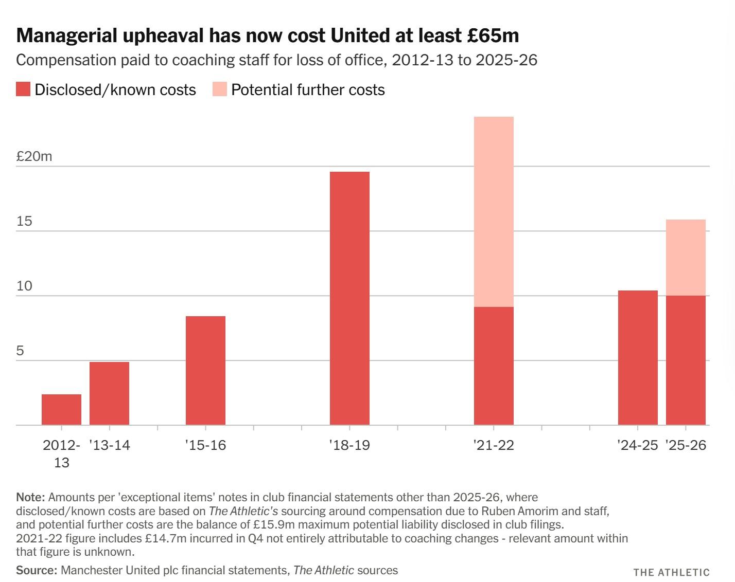 對財務狀況而言,或許更重要的是繼續聘用以及——這在足球界很可能發生,尤其是在近期的曼聯——最終解僱卡里克需要花費多少。就像球員薪水一樣,主教練的薪水從未可靠地公開過,但可以合理地認爲,如果他留在老特拉福德教練席,俱樂部花費會比聘請一位更受追捧、名氣更大的人物要少。相應地,如果事情進展不順,解僱他的成本也會更低。一月初解僱阿莫林及其教練組,使曼聯面臨最高1590萬英鎊的和解賠償金,這與近年來一系列類似的支出相當。解僱滕哈格花費了1040萬英鎊;三年前解僱索爾斯克亞花費了910萬英鎊;2018年12月解僱若澤-穆里尼奧花費了1960萬英鎊——這是俱樂部歷史上支付給主教練的最高和解金。