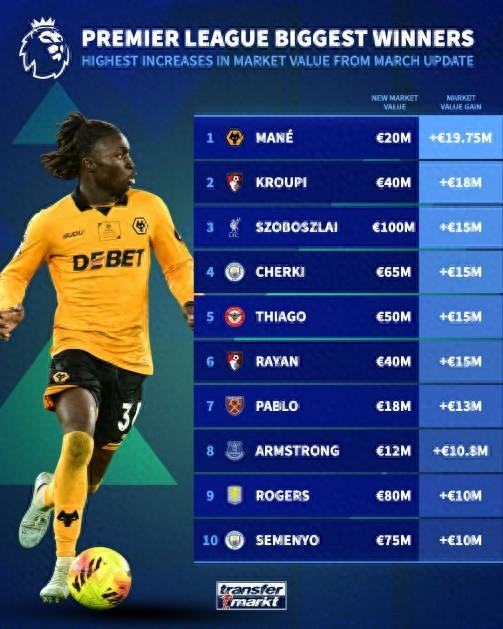 英超身價漲幅榜:索博斯洛伊上漲1500萬歐達1億,謝爾基上漲1500萬歐