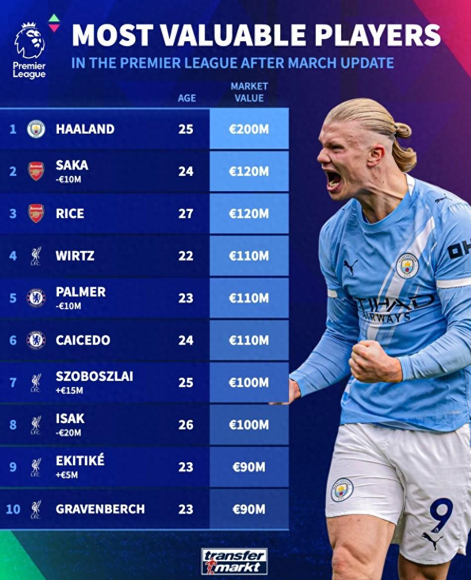 北京時間3月9日,在更新了英超球員的身價之後,德轉還統計出了此次更新後英超身價最高的10名球員,哈蘭德繼續以2億歐元高舉第一,身價下跌1000萬歐元的薩卡以1.2億歐元與隊友賴斯並列第二。