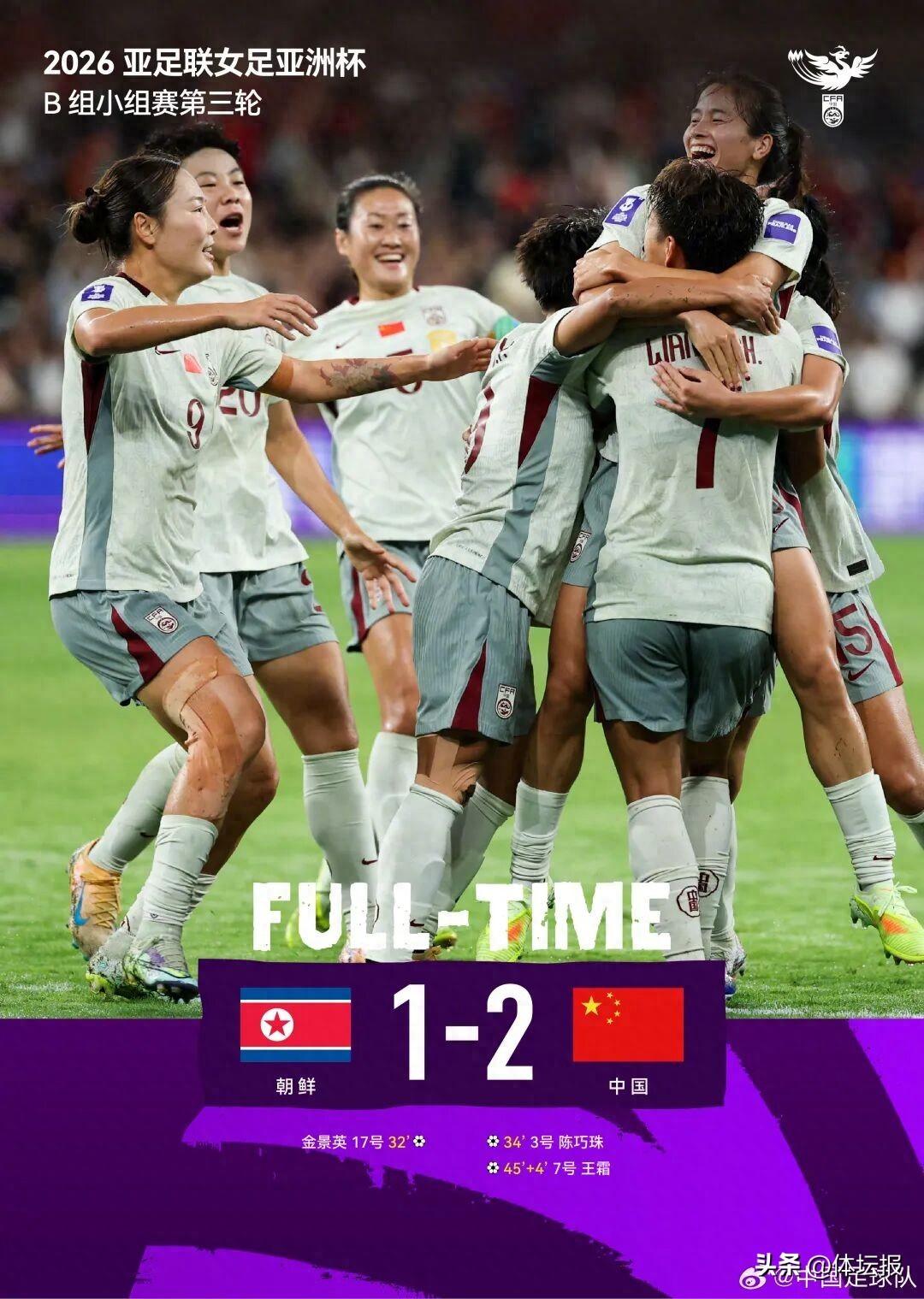 北京時間3月9日晚,在女足亞洲盃小組賽B組最後一輪比賽中,衛冕冠軍中國隊以2:1擊敗朝鮮隊,位列小組第一名出線。本場比賽中,朝鮮女足率先破門,陳巧珠閃電扳平,王霜進球反超。