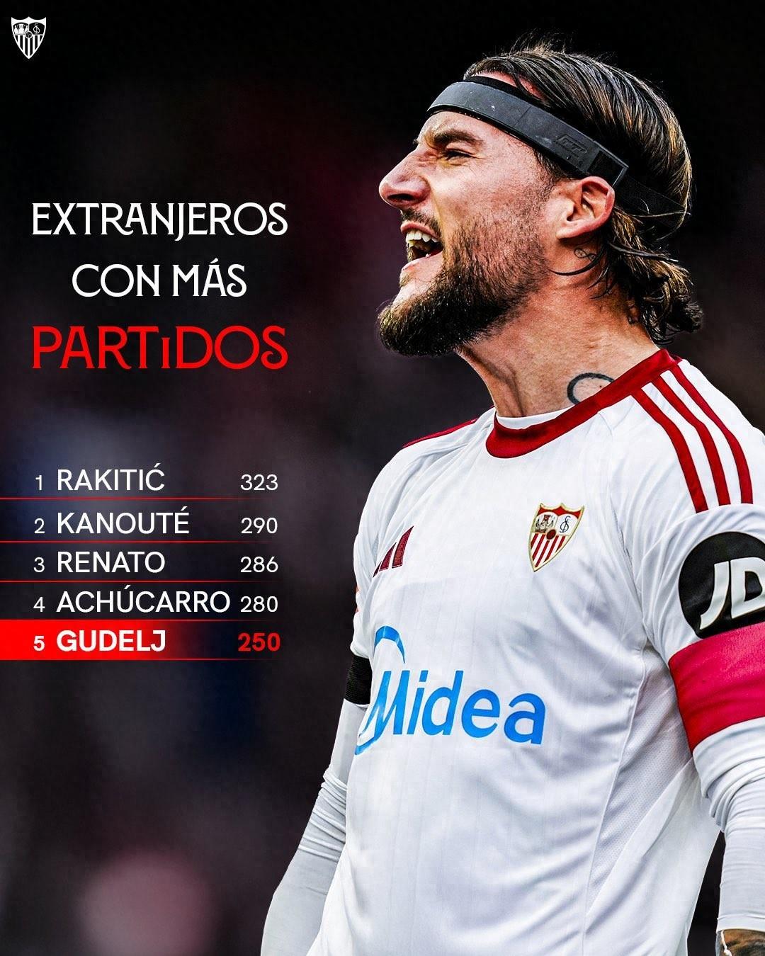 北京時間3月9日,西甲第27輪,塞維利亞坐鎮主場迎戰巴列卡諾,最終塞維利亞1-1戰平巴列卡諾,本場比賽,塞維利亞隊長古德利代表球隊首發出場並打滿全場。據塞維利亞官方統計,這場比賽是古德利代表球隊出場的第250次,他也超越阿爾維斯(249場)成爲塞維利亞隊史出場次數第五多的外籍球員。