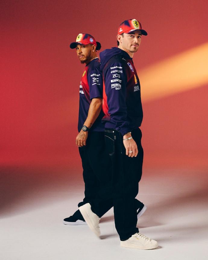 在官方發佈的宣傳照片中,兩位車手——夏爾-勒克萊爾和劉易斯-漢密爾頓均身穿這款中國站限定隊服亮相。深沉的黑色基調搭配法拉利標誌性的紅色細節,不僅延續了車隊經典視覺體系,也爲中國站賽事增添了獨特紀念意義。