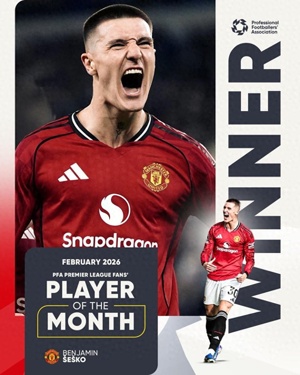 北京時間3月10日,英格蘭職業球員協會PFA官方宣佈,曼聯前鋒謝什科當選由他們評出的英超2月最佳球員。