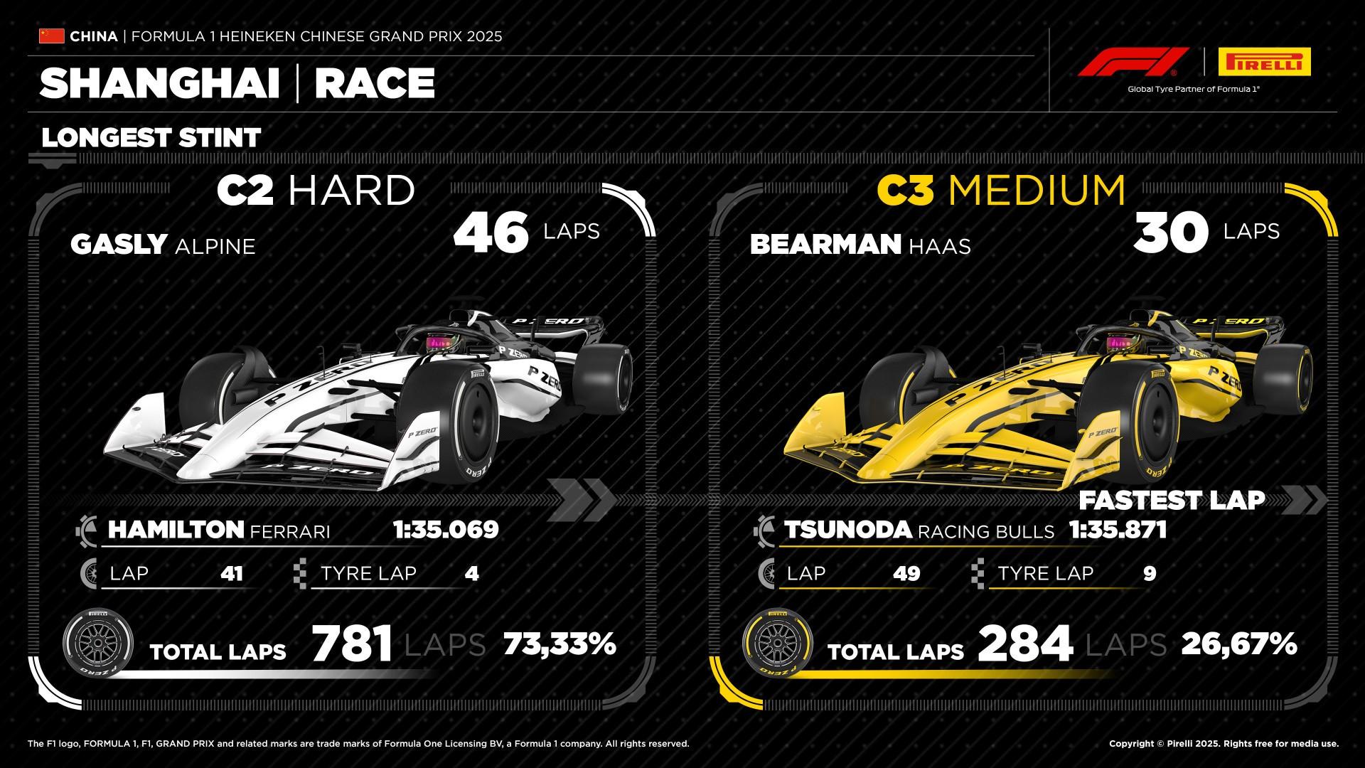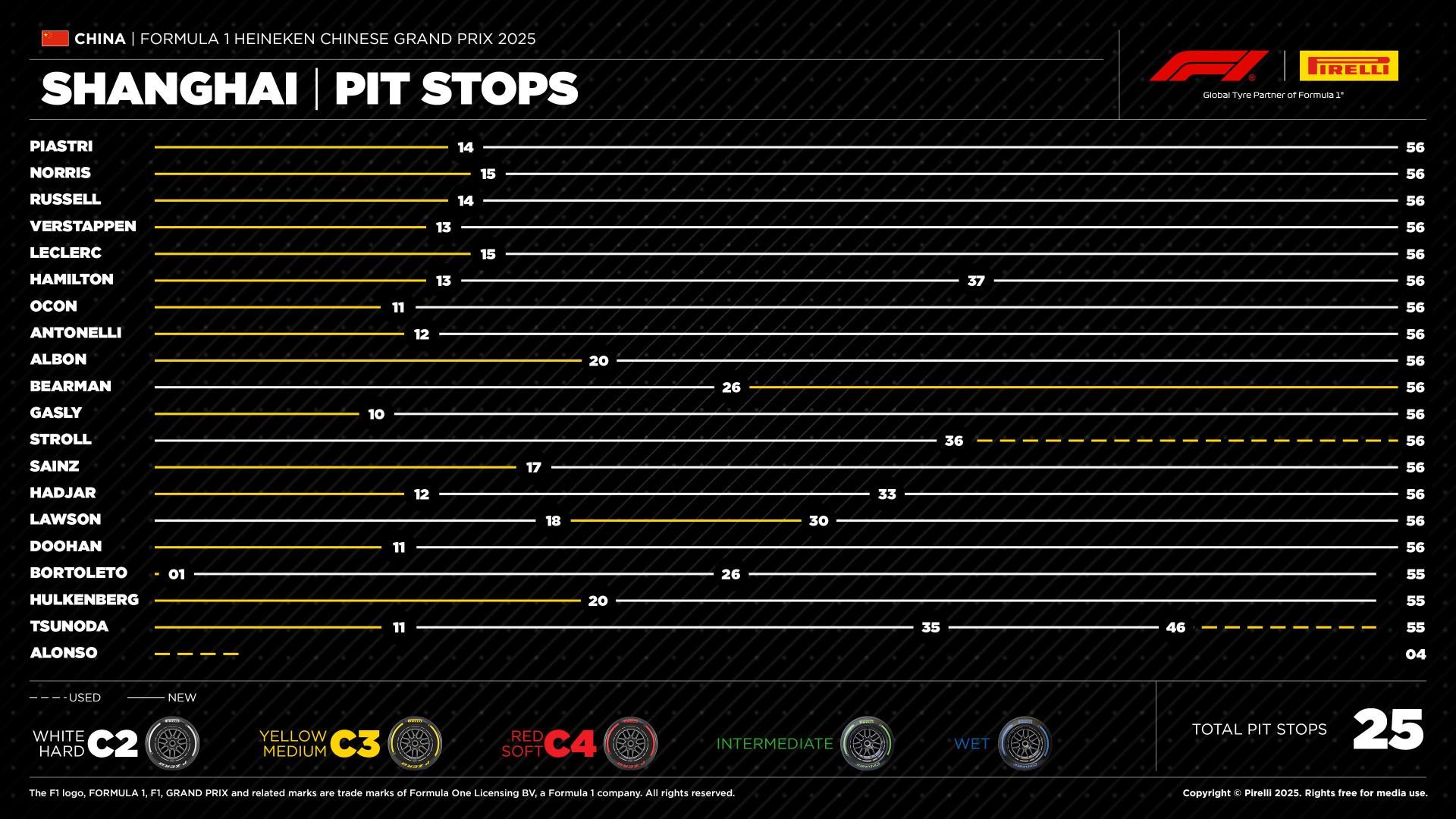 2025賽季,只有三位車手使用硬胎起跑,其餘車手都選擇了中性胎。全程無人使用軟胎。最常見的策略是一停,即在最後階段使用最硬的輪胎跑很久。賽道數據顯示,硬胎的顆粒化程度較低,即使在長距離也能保持穩定的性能。登上領獎臺的車手都在第14圈到第15圈之間進站。邁凱倫最終包攬一二,皮亞斯特里最終奪冠,隊友諾里斯獲得亞軍,拉塞爾獲得季軍。