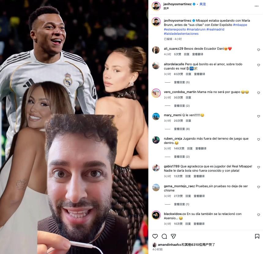 哈維-奧約斯在自己的社媒賬號上還表示:“我必須說,她一直都在保護這段關係,因爲每次我們在節目或者其他場合問到這個問題——大家也知道,這件事已經傳了很久——她一直都是選擇否認。但我也不知道現在艾斯特-愛珀斯托的事情曝光之後,她還會不會繼續否認,也許現在這件事對她來說已經沒那麼輕鬆了。瑪麗亞,說點什麼吧,真的該回應一下了!當然,也有可能姆巴佩只是單身,正在享受生活,同時和不同的人保持來往。”