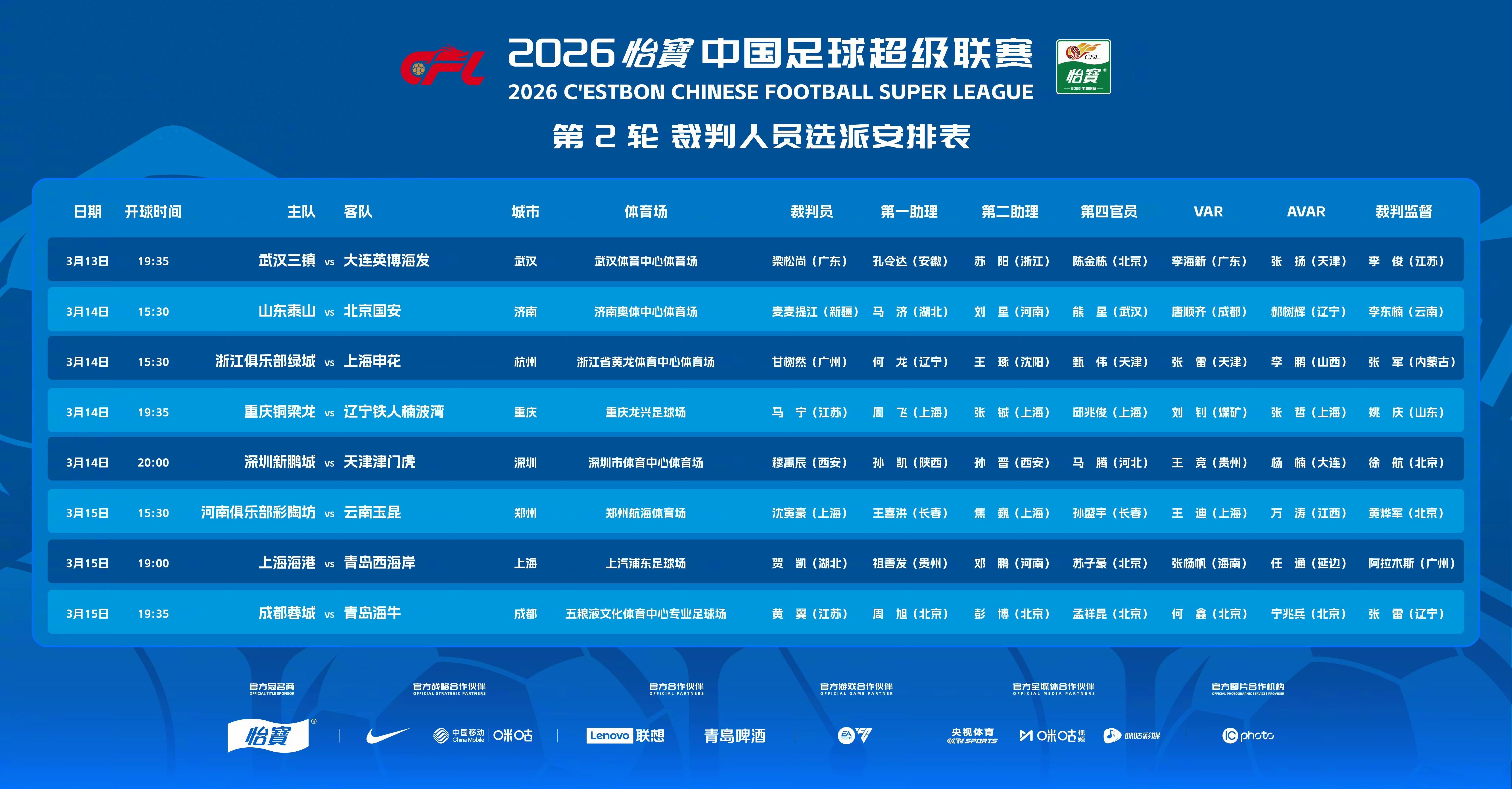 北京時間3月13日,中超第2輪裁判名單公佈,麥麥提江執法京魯大戰,唐順齊擔任VAR,馬寧吹重慶銅梁龍vs遼寧鐵人。