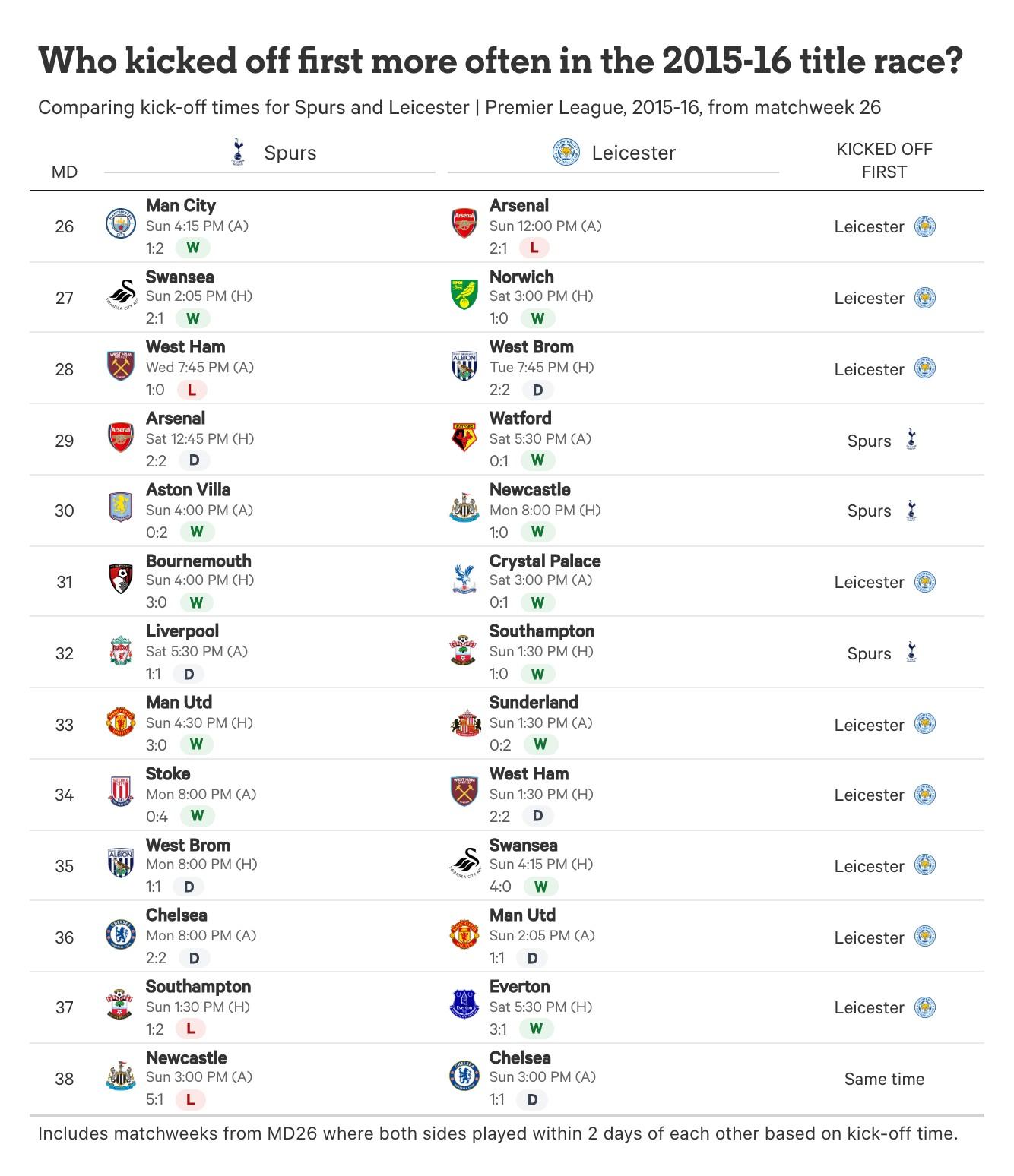 數據支持了他們的懷疑。在那個賽季最後13輪比賽中——就本文而言,這是“冠軍衝刺階段”的界定——萊斯特城有9次先賽,相比之下熱刺只有3次,而最後一輪,像往常一樣,所有10場頂級聯賽同時開球。對熱刺來說,這包括連續三場週一比賽,最後一場以一場火藥味十足的2-2客場戰平切爾西告終,這個結果將冠軍拱手送給了克勞迪奧-拉涅利、傑米-瓦爾迪和他的隊友們。