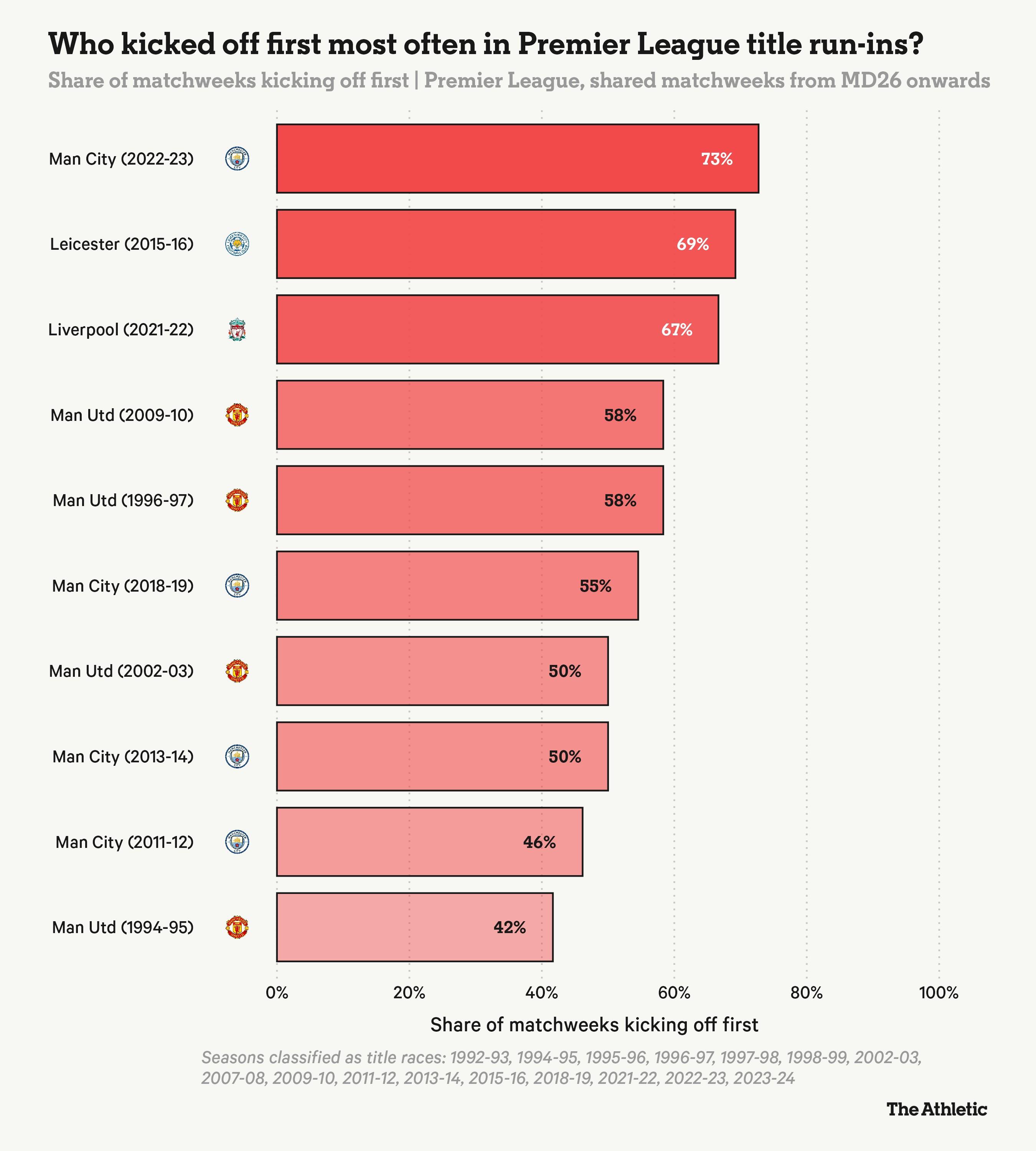 在所有冠軍衝刺階段中,萊斯特城那年在69%的比賽中先賽,這是自1992年英超時代開始以來的第二高比例。