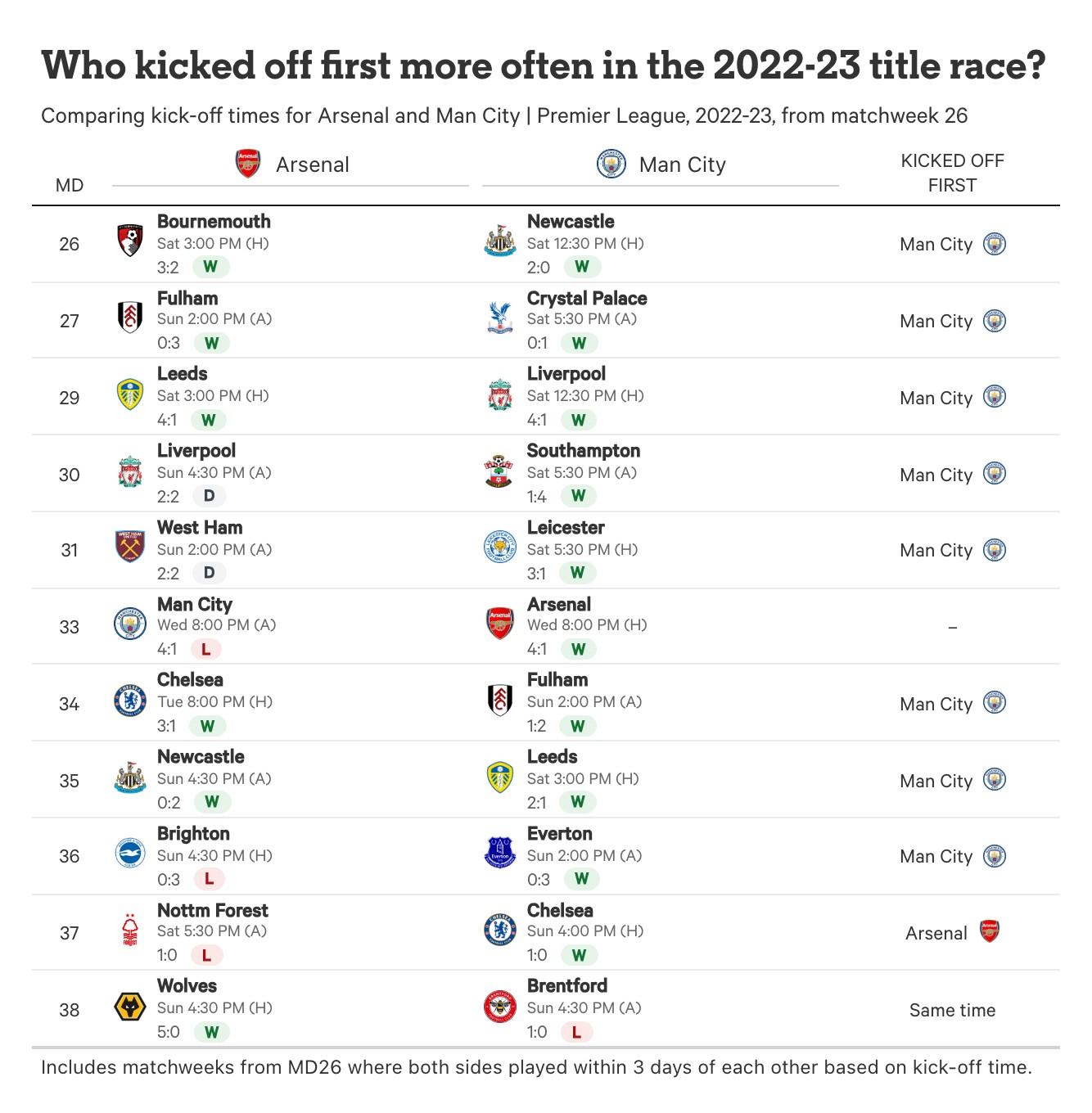 在2022-23賽季的衝刺階段比賽中,曼城在73%的比賽中先賽,他們追上了阿森納8分的領先優勢,連續第三年贏得聯賽冠軍,也是六個賽季中的第五次。