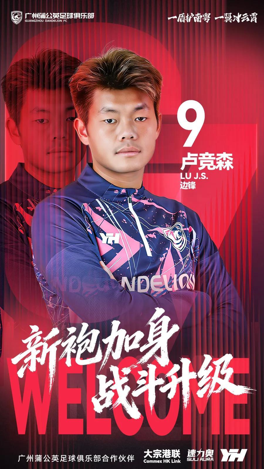 盾護南粵,翼衝雲霄。2026賽季盧競森將身穿廣州蒲公英戰袍出征各項賽事,期待他未來爲廣州球迷帶來更多精彩表現,與廣州蒲公英一同書寫更多新篇章!