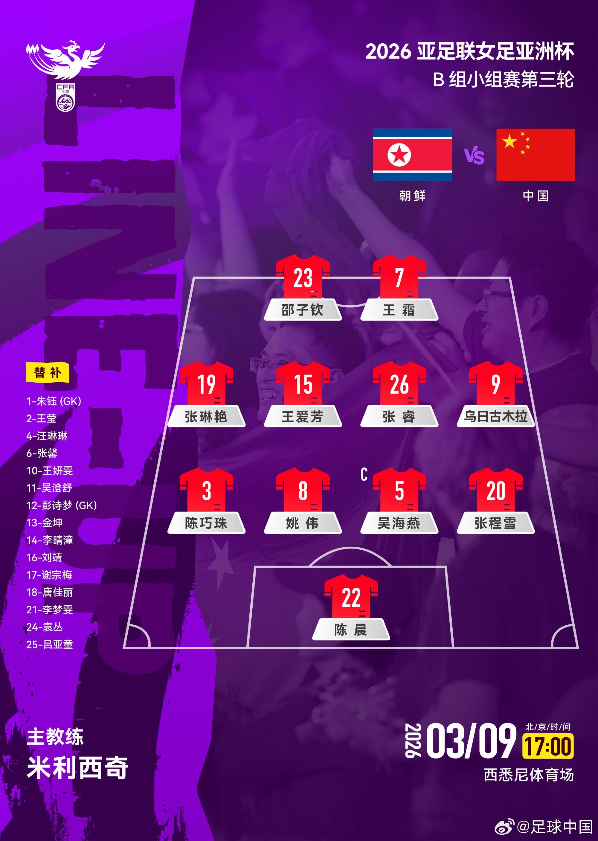 中國女足vs朝鮮女足首發:22-陳晨、3-陳巧珠、5-吳海燕、8-姚偉、20-張程雪、7-王霜、26-張睿、15-王愛芳、19-張琳豔、9-烏日古木拉、23-邵子欽。