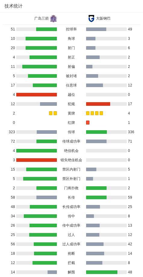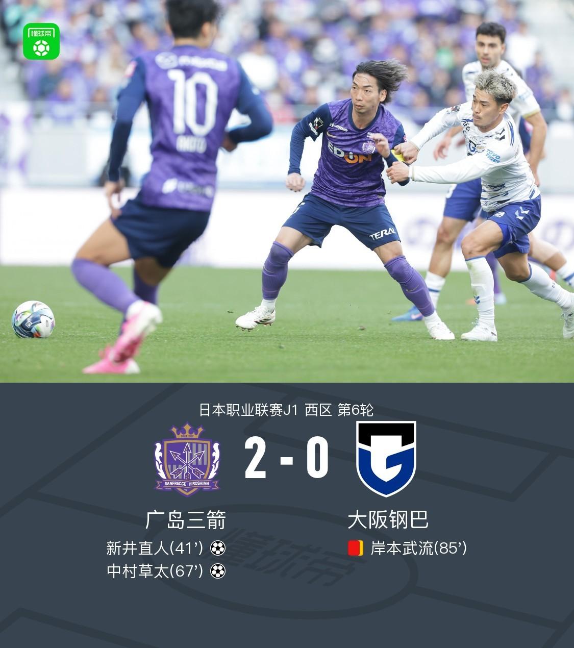 廣島三箭2-0大阪鋼巴,新井直人、中村草太破門,岸本武流染紅