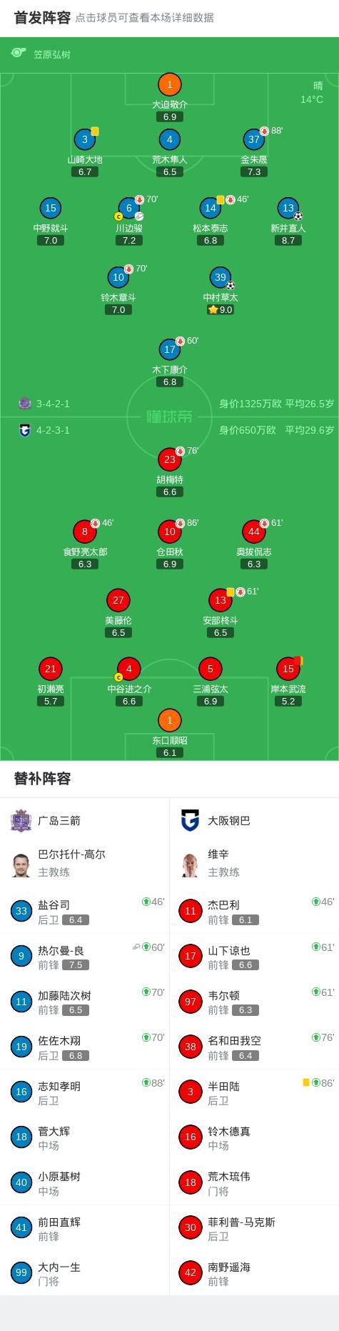 第67分鐘,熱爾曼-良助攻中村草太單刀破門,廣島三箭2-0