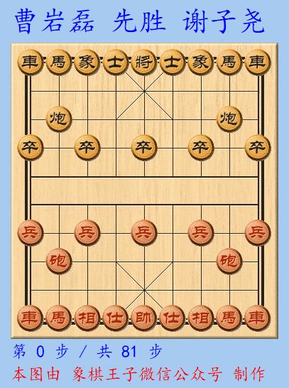 與廣州名手、穗地棋王謝子堯的一役,曹巖磊執紅棋在仙人指路對卒底炮,紅方右中炮、黑左中炮陣中。